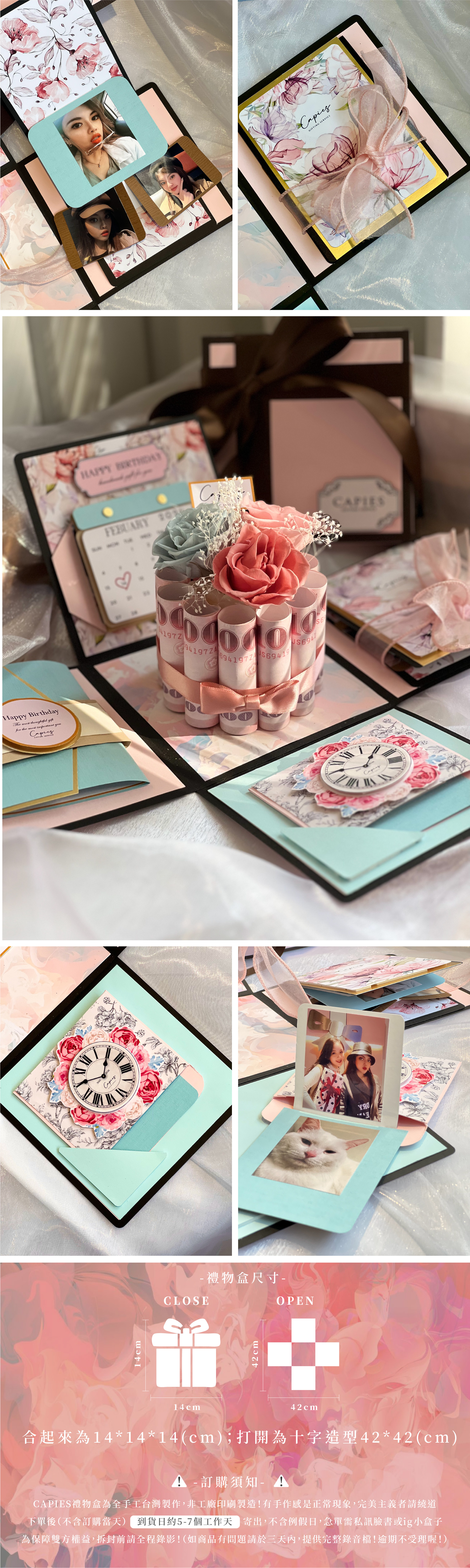 讓您在特殊的時刻,送出一份獨特的禮物,如童話般得色彩設計推薦送給充滿少女心的她,內部精緻的有錢花座與許多的創意相片機關,讓你在送禮同時,除了紀念兩人的精采時刻也飽含了滿滿心意